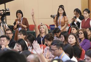 (250901) -- BEIJING, 1 septiembre, 2025 (Xinhua) -- Periodistas levantan las manos para hacer preguntas durante una entrevista grupal llevada a cabo por el centro de prensa para los eventos conmemorativos del 80º aniversario de la victoria en la Guerra de Resistencia del Pueblo Chino contra la Agresión Japonesa y la Guerra Mundial Antifascista, en Beijing, capital de China, el 1 de septiembre de 2025. (Xinhua/Yin Gang) (rtg) (ah) (ce)