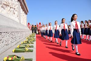 (250930) -- BEIJING, 30 septiembre, 2025 (Xinhua) -- Una ceremonia para ofrendar cestas de flores a los héroes nacionales caídos para conmemorar el Día de los Mártires se lleva a cabo en la Plaza Tian'anmen, en Beijing, capital de China, el 30 de septiembre de 2025. (Xinhua/Li Xiang) (jg) (ra)