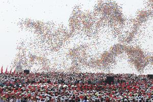 (250902) — BEIJING, 2 septiembre, 2025 (Xinhua) — Globos son lanzados durante una gran concentración para conmemorar el 80° aniversario de la victoria en la Guerra de Resistencia del Pueblo Chino contra la Agresión Japonesa y la Guerra Mundial Antifascista, en Beijing, capital de China, el 3 de septiembre de 2025. (Xinhua/Zhang Chen) (vf) (ce)