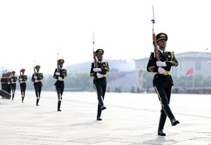 (250902) -- BEIJING, 2 septiembre, 2025 (Xinhua) -- Guardias del desfile marchan en el sitio durante una gran concentración para conmemorar el 80° aniversario de la victoria en la Guerra de Resistencia del Pueblo Chino contra la Agresión Japonesa y la Guerra Mundial Antifascista, en Beijing, capital de China, el 3 de septiembre de 2025. (Xinhua/Li Ming) (ce)