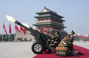 (250902) -- BEIJING, 2 septiembre, 2025 (Xinhua) -- Soldados disparan cañonazos de salva durante una gran concentración para conmemorar el 80° aniversario de la victoria en la Guerra de Resistencia del Pueblo Chino contra la Agresión Japonesa y la Guerra Mundial Antifascista, en Beijing, capital de China, el 3 de septiembre de 2025. (Xinhua/Mu Yu) (vf) (ce)