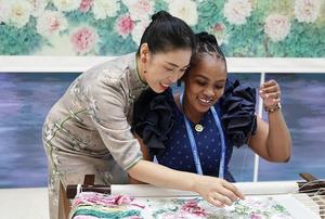 (251014) -- BEIJING, 14 octubre, 2025 (Xinhua) -- Una visitante de Botsuana prueba el bordado chino en una exposición que muestra el progreso de China en el empoderamiento digital e inteligente para mujeres y niñas, en Beijing, capital de China, el 14 de octubre de 2025. La exposición se inauguró el martes como un evento paralelo de la Conferencia de Líderes Mundiales sobre la Mujer. (Xinhua/Zhang Yuwei) (oa) (ah) (vf)