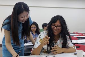 (250521) -- BEIJING, 21 mayo, 2025 (Xinhua) -- Imagen del 22 de abril de 2025 de la profesora de idioma chino, Liang Qing (i), del Instituto Confucio de la Pontificia Universidad Católica del Perú, instruyendo a una alumna peruana a escribir caligrafía china, en Lima, Perú. China aplicará una política de exención de visado a los ciudadanos de Brasil, Argentina, Chile, Perú y Uruguay, a modo de prueba, desde el 1 de junio de 2025 hasta el 31 de mayo de 2026, anunció el jueves pasado el Ministerio de Relaciones Exteriores chino. (Xinhua/Mariana Bazo) (ra) (ce)