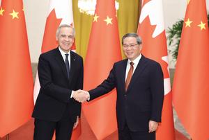 (260115) — BEIJING, 15 enero, 2026 (Xinhua) — El primer ministro chino, Li Qiang, sostiene conversaciones con el primer ministro canadiense, Mark Carney, quien se encuentra en visita oficial a China, en el Gran Palacio del Pueblo, en Beijing, capital de China, el 15 de enero de 2026. (Xinhua/Huang Jingwen) (jg) (ah) (vf)