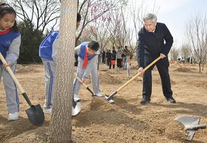 (250403) — BEIJING, 3 abril, 2025 (Xinhua) — Li Xi planta un árbol durante una actividad voluntaria de plantación de árboles, en el distrito de Fengtai de Beijing, capital de China, el 3 de abril de 2025. Xi Jinping y otros líderes del Partido y del Estado, entre ellos Li Qiang, Zhao Leji, Wang Huning, Cai Qi, Ding Xuexiang, Li Xi y Han Zheng, llegaron por la mañana al lugar de plantación de árboles a orillas de un río en el distrito de Fengtai y plantaron árboles con los funcionarios y los habitantes locales. (Xinhua/Yue Yuewei) (jg) (ah) (ce)