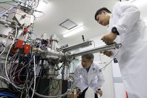 (250410) -- BEIJING, 10 abril, 2025 (Xinhua) -- Imagen del 8 de abril de 2025 del investigador principal, Hu Sen (i), trabajando con la muestra lunar en el Laboratorio del Espectrómetro de Masas de Iones Nano Secundarios (NanoSIMS Lab, por sus siglas en inglés) del Instituto de Geología y Geofísica de la Academia de Ciencias de China, en Beijing, capital de China. El último descubrimiento de muestras de rocas traídas por la misión lunar Chang'e-6 de China revela que el manto lunar contiene menos agua en el lado oculto que en el lado visible, lo que sugiere que el "hemisferio oculto", que siempre mira en dirección opuesta a la Tierra, tiende a ser mucho más seco. Publicado el miércoles en la revista Nature, un nuevo estudio realizado por científicos chinos descubrió que el contenido de agua en cada gramo de la gruesa capa rocosa bajo la superficie del lado oculto de la luna es inferior a 2 microgramos, el nivel más bajo jamás registrado. (Xinhua/Jin Liwang) (da) (ra) (ce)