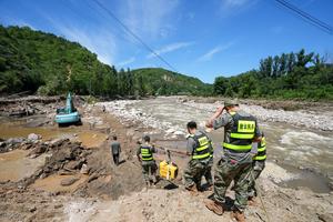 (250730) -- BEIJING, 30 julio, 2025 (Xinhua) -- Rescatistas entregan suministros de socorro a pie a aldeas con carreteras bloqueadas, en el poblado de Fengjiayu, en el distrito de Miyun de Beijing, capital de China, el 30 de julio de 2025. Debido a las fuertes y continuas lluvias de los últimos días, cientos de aldeas en varios distritos de Beijing se han visto afectadas. (Xinhua/Ju Huanzong) (ah) (ra) (vf)