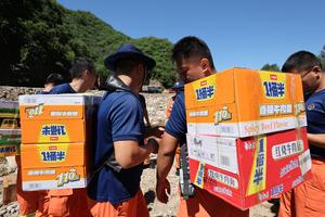 (250730) -- BEIJING, 30 julio, 2025 (Xinhua) -- Rescatistas entregan suministros de socorro a aldeas con carreteras bloqueadas, en el poblado de Fengjiayu, en el distrito de Miyun de Beijing, capital de China, el 30 de julio de 2025. Debido a las fuertes y continuas lluvias de los últimos días, cientos de aldeas en varios distritos de Beijing se han visto afectadas. (Xinhua) (ah) (ra) (vf)