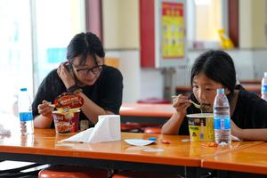 (250729) -- BEIJING, 29 julio, 2025 (Xinhua) -- Residentes toman sus alimentos en un sitio de reasentamiento en una escuela secundaria local, en el distrito de Miyun, en Beijing, capital de China, el 29 de julio de 2025. En Beijing se están llevando a cabo operaciones de rescate y socorro tras las intensas tormentas que azotan la ciudad. (Xinhua/Ju Huanzong) (oa) (ah)