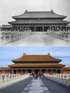 (251010) -- BEIJING, 10 octubre, 2025 (Xinhua) -- Imagen combinada del Palacio de la Pureza Celestial (Qianqing gong) del Museo del Palacio a principios del Siglo XX (arriba, proveída por el Museo del Palacio) y del 10 de octubre de 2025 (abajo, imagen del fotógrafo de Xinhua, Jin Liangkuai), en Beijing, capital de China. Este año se conmemora el centenario de la fundación del Museo del Palacio. (Xinhua) (rtg) (ra) (vf)