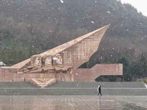 (250315) -- BEIJING, 15 marzo, 2025 (Xinhua) -- Imagen tomada con un teléfono móvil de turistas visitando el Museo de Aviación de China bajo la nieve, en el distrito de Changping de Beijing, China, el 15 de marzo de 2025. El sábado nevó en Beijing y la temperatura bajó significativamente. (Xinhua/Cai Yang) (rtg) (da)