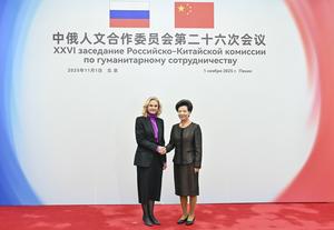 (251101) -- BEIJING, 1 noviembre, 2025 (Xinhua) -- La consejera de Estado china, Shen Yiqin, y la viceprimera ministra rusa, Tatyana Golikova, copresiden la 26ª sesión del Comité de Cooperación en Humanidades China-Rusia, en Beijing, capital de China, el 1 de noviembre de 2025. (Xinhua/Yin Bogu) (jg) (da)