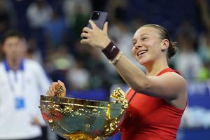 (251005) -- BEIJING, 5 octubre, 2025 (Xinhua) -- Amanda Anisimova se toma una fotografía durante la ceremonia de premiación al término del partido final de individuales femeninos entre Amanda Anisimova, de Estados Unidos, y Linda Noskova, de República Checa, en el torneo de tenis China Open 2025, en Beijing, China, el 5 de octubre de 2025. (Xinhua/Bai Xuefei) (rtg) (ah)