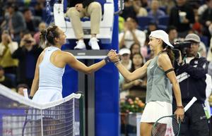 (250927) -- BEIJING, 27 septiembre, 2025 (Xinhua) -- Zheng Qinwen (i) saluda a Emiliana Arango al término del partido de segunda ronda de individuales femeninos entre Zheng Qinwen, de China, y Emiliana Arango, de Colombia, en el torneo de tenis China Open 2025, en Beijing, China, el 27 de septiembre de 2025. (Xinhua/Bai xuefei) (jg) (rtg) (vf)