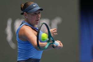 (251004) -- BEIJING, 4 octubre, 2025 (Xinhua) -- Amanda Anisimova devuelve la pelota durante el partido de semifinal de individuales femeninos entre Coco Gauff, de Estados Unidos, y Amanda Anisimova, de Estados Unidos, en el torneo de tenis China Open 2025, en Beijing, China, el 4 de octubre de 2025. (Xinhua/Xie Han) (oa) (ra) (ce)