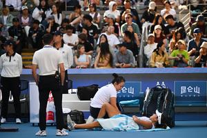 (250929) -- BEIJING, 29 septiembre, 2025 (Xinhua) -- Camila Osorio (abajo) recibe tratamiento médico durante el partido de tercera ronda de individuales femeninos entre Iga Swiatek, de Polonia, y Camila Osorio, de Colombia, en el torneo de tenis China Open 2025, en Beijing, China, el 29 de septiembre de 2025. (Xinhua/Xin Mengchen) (rtg) (ah) (ce)