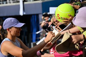 (250929) -- BEIJING, 29 septiembre, 2025 (Xinhua) -- Iga Swiatek firma autógrafos para los aficionados al término del partido de tercera ronda de individuales femeninos entre Iga Swiatek, de Polonia, y Camila Osorio, de Colombia, en el torneo de tenis China Open 2025, en Beijing, China, el 29 de septiembre de 2025. (Xinhua/Xin Mengchen) (rtg) (ah) (ce)