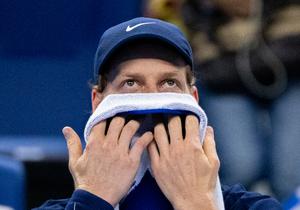 (250925) -- BEIJING, 25 septiembre, 2025 (Xinhua) -- Jannik Sinner reacciona durante el partido de primera ronda de individuales masculinos entre Jannik Sinner, de Italia, y Marin Cilic, de Croacia, en el torneo de tenis China Open 2025, en Beijing, China, el 25 de septiembre de 2025. (Xinhua/Hu Jingwen) (rtg) (ra) (vf)