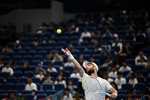 (250928) -- BEIJING, 28 septiembre, 2025 (Xinhua) -- Corentin Moutet sirve la pelota durante el partido de segunda ronda de individuales masculinos entre Corentin Moutet, de Francia y Alexander Zverev, de Alemania, en el torneo de tenis China Open 2025, en Beijing, China, el 28 de septiembre de 2025. (Xinhua/Xi Mengchen) (rtg) (ah)