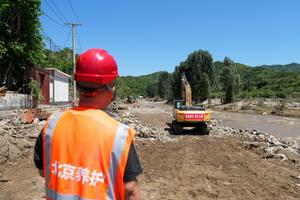 (250730) — BEIJING, 30 julio, 2025 (Xinhua) — Trabajadores de emergencia intentan restaurar una carretera dañada, en el poblado de Fengjiayu, en el distrito de Miyun de Beijing, capital de China, el 30 de julio de 2025. Debido a las fuertes y continuas lluvias de los últimos días, cientos de aldeas en varios distritos de Beijing se han visto afectadas. (Xinhua/Ju Huanzong) (ah) (ra) (vf)