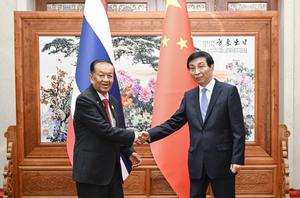 (250622) -- BEIJING, 22 junio, 2025 (Xinhua) -- Wang Huning, presidente del Comité Nacional de la Conferencia Consultiva Política del Pueblo Chino (CCPPCh), se reúne con el presidente de la Asamblea Nacional y presidente de la Cámara de Representantes de Tailandia, Wan Muhamad Noor Matha, en Beijing, capital de China, el 22 de junio de 2025. (Xinhua/Zhang Ling) (rtg) (da)