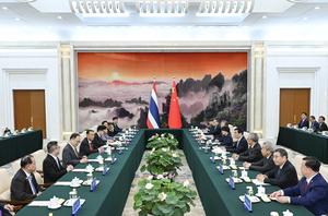 (250622) -- BEIJING, 22 junio, 2025 (Xinhua) -- Wang Huning, presidente del Comité Nacional de la Conferencia Consultiva Política del Pueblo Chino (CCPPCh), se reúne con el presidente de la Asamblea Nacional y presidente de la Cámara de Representantes de Tailandia, Wan Muhamad Noor Matha, en Beijing, capital de China, el 22 de junio de 2025. (Xinhua/Zhang Ling) (rtg) (da)