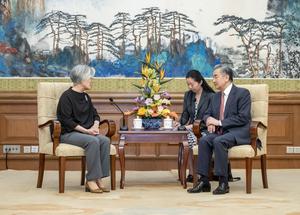 (250521) — BEIJING, 21 mayo, 2025 (Xinhua) — El ministro de Relaciones Exteriores chino, Wang Yi, también miembro del Buró Político del Comité Central del Partido Comunista de China, se reúne con Kyung-wha Kang, presidenta de la Asia Society de Estados Unidos, en Beijing, capital de China, el 20 de mayo de 2025. (Xinhua/Zhai Jianlan) (jg) (da) (ce)