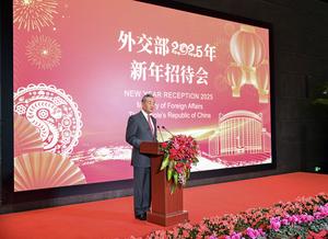 (250124) — BEIJING, 24 enero, 2025 (Xinhua) — El ministro de Relaciones Exteriores chino, Wang Yi, también miembro del Buró Político del Comité Central del Partido Comunista de China, preside la recepción de Año Nuevo 2025 del Ministerio de Relaciones Exteriores de China en el Centro de Artes Escénicas de Beijing, en Beijing, capital de China, el 24 de enero de 2025. (Xinhua/Yin Bogu) (jg) (da) (ce)