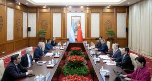 (250514) -- BEIJING, 14 mayo, 2025 (Xinhua) -- El ministro de Relaciones Exteriores chino, Wang Yi, también miembro del Buró Político del Comité Central del Partido Comunista de China, se reúne con el ministro de Relaciones Exteriores hondureño, Eduardo Enrique Reina, en Beijing, capital de China, el 14 de mayo de 2025. (Xinhua/Zhai Jianlan) (ah) (ra) (ce)