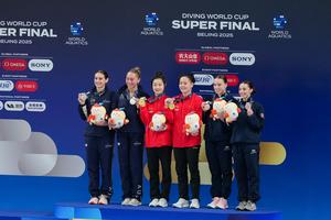 (250502) -- BEIJING, 2 mayo, 2025 (Xinhua) -- Las medallistas de oro Chang Yani (3-i)/Chen Yiwen (3-d), de China, posan junto a las medallistas de plata Alysha Kolol (2-i)/Maddison Keeney (i), de Australia, y las medallistas de bronce Yasmin Harper (2-d)/Scarlett Mew Jensen, de Reino Unido, durante la ceremonia de premiación para el evento de 3m sincronizado femenino en la Súper Final de la Copa del Mundo de Clavados 2025 de World Aquatics, en Beijing, capital de China, el 2 de mayo de 2025. (Xinhua/Ju Huanzong) (rtg) (ra) (vf)