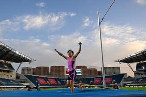 (250907) -- BEIJING, 7 septiembre, 2025 (Xinhua) -- Zhong Tao, de China, festeja durante el evento de salto con pértiga masculino en el World Athletics Continental Tour 2025, en Beijing, China, el 7 de septiembre de 2025. (Xinhua/Ju Huanzong) (rtg) (ah)