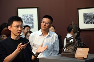(250826) -- BEIJING, 26 agosto, 2025 (Xinhua) -- El escultor Lang Yue (i-frente) presenta su obra escultórica en una exposición de arte que destaca la Guerra de Resistencia del Pueblo Chino contra la Agresión Japonesa, en Beijing, capital de China, el 26 de agosto de 2025. La agencia nacional de noticias de China, Xinhua, inauguró el martes una exposición de arte que destaca la Guerra de Resistencia del Pueblo Chino contra la Agresión Japonesa. La exposición, inaugurada en el Centro Nacional de Información Financiera en Beijing, presenta más de 140 fotografías, reliquias de la época de la guerra y más de 10 obras de pintura y escultura. (Xinhua/Jin Liangkuai) (jg) (ra) (vf)