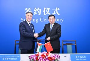 (251107) — BEIJING, 7 noviembre, 2025 (Xinhua) — Fu Hua, presidente de la Agencia de Noticias Xinhua, y Ahmed Assaf, supervisor general de Medios de Comunicación Oficiales Palestinos y presidente de la junta directiva de la Agencia Palestina de Noticias e Información (WAFA), asisten a la ceremonia de firma de un memorando de entendimiento sobre cooperación, en Beijing, capital de China, el 7 de noviembre de 2025. La Agencia de Noticias Xinhua y la WAFA firmaron el viernes en Beijing un memorando de entendimiento sobre cooperación, acordando ampliar la colaboración en áreas como la capacitación de periodistas y la cobertura conjunta. (Xinhua/Li Xiang) (jg) (rtg) (ce)