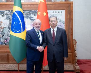 (250513) -- BEIJING, 13 mayo, 2025 (Xinhua) -- Zhao Leji, presidente del Comité Permanente de la Asamblea Popular Nacional, se reúne con el presidente de Brasil, Luiz Inácio Lula da Silva, en Beijing, capital de China, el 13 de mayo de 2025. (Xinhua/Zhai Jianlan) (ah) (ra) (ce)