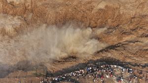 (250727) -- JIXIAN, 27 julio, 2025 (Xinhua) -- Vista aérea tomada por un dron el 27 de julio de 2025 de personas visitando la cascada Hukou en el río Amarillo, en el distrito de Jixian, en la provincia de Shanxi, en el norte de China. La cascada Hukou está experimentando un aumento del caudal de agua últimamente. (Xinhua/Liu Hongda) (oa) (da)