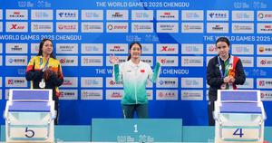 (250811) -- CHENGDU, 11 agosto, 2025 (Xinhua) -- La medallista de oro, Huang Jingqiu (c), de China, la medallista de plata, María Carolina Rodríguez Angarita (i), de Colombia, y la medallista de bronce, Marta Pozzi, de Italia, asisten a la ceremonia de premiación de la final de dinámica femenina sin aletas - FFS1-FFS2 del evento de apnea en los Juegos Mundiales 2025, en Chengdu, en la provincia de Sichuan, en el suroeste de China, el 11 de agosto de 2025. (Xinhua/Wang Xi) (oa) (ah) (ce)