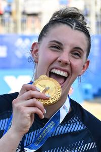 (250812) — CHENGDU, 12 agosto, 2025 (Xinhua) — Una jugadora de Argentina festeja con su medalla de oro durante la ceremonia de premiación del evento de balonmano de playa femenino en los Juegos Mundiales 2025, en Chengdu, en la provincia de Sichuan, en el suroeste de China, el 12 de agosto de 2025. (Xinhua/Chen Zhenhai) (oa) (ah) (ce)