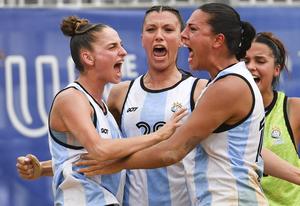 (250811) -- CHENGDU, 11 agosto, 2025 (Xinhua) -- Jugadoras de Argentina festejan durante la semifinal femenina entre Argentina y España en el evento de balonmano de playa de los Juegos Mundiales 2025, en Chengdu, en la provincia de Sichuan, en el suroeste de China, el 11 de agosto de 2025. (Xinhua/Zhang Bowen) (oa) (ah) (vf)
