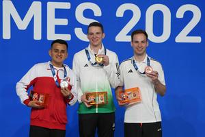 (250815) -- CHENGDU, 15 agosto, 2025 (Xinhua) -- Imagen del 14 de agosto de 2025 del medallista de oro Oliver Szolnoki (c), de Hungría, el medallista de plata Gerson Martínez (i), de Perú, y el medallista de bronce Joshua Filler, de Alemania, posando durante la ceremonia de premiación de pool masculino del evento de billar en los Juegos Mundiales 2025, en Chengdu, en la provincia de Sichuan, en el suroeste de China. (Xinhua/Xu Bingjie) (oa) (ra) (vf)