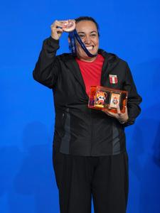(250815) -- CHENGDU, 15 agosto, 2025 (Xinhua) -- Imagen del 14 de agosto de 2025 de la medallista de bronce, Jackeline Pérez, de Perú, posando durante la ceremonia de premiación de carambola de tres bandas femenino del evento de billar en los Juegos Mundiales 2025, en Chengdu, en la provincia de Sichuan, en el suroeste de China. (Xinhua/Xu Bingjie) (oa) (ra) (vf)