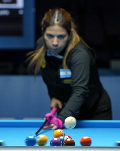 (250812) -- CHENGDU, 12 agosto, 2025 (Xinhua) -- Soledad Ayala, de Argentina, compite durante el partido de cuartos de final de pool femenino de billar entre Soledad Ayala, de Argentina, y Liu Shasha, de China, en los Juegos Mundiales 2025, en Chengdu, en la provincia de Sichuan, en el suroeste de China, el 12 de agosto de 2025. (Xinhua/Xu Bingjie) (jg) (ra)