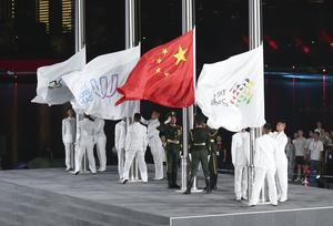 (250807) -- CHENGDU, 7 agosto, 2025 (Xinhua) -- La bandera del Comité Olímpico Internacional, la bandera de la Asociación Internacional de los Juegos Mundiales, la bandera nacional china y la bandera del Comité Organizador de los Juegos Mundiales 2025 de Chengdu son izadas durante la ceremonia de inauguración de los Juegos Mundiales 2025, en Chengdu, en la provincia de Sichuan, en el suroeste de China, el 7 de agosto de 2025. (Xinhua/Jiang Kehong) (da) (ra) (vf)
