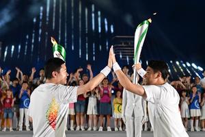 (250807) -- CHENGDU, 7 agosto, 2025 (Xinhua) -- Los portadores de la antorcha Ding Junhui (i) y Dong Dong chocan las manos durante la ceremonia de inauguración de los Juegos Mundiales 2025, en Chengdu, en la provincia de Sichuan, en el suroeste de China, el 7 de agosto de 2025. (Xinhua/Chen Zhenhai) (jg) (ah) (ce)