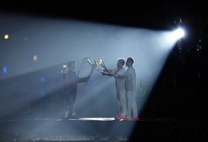(250807) -- CHENGDU, 7 agosto, 2025 (Xinhua) -- Los portadores de la antorcha Ding Junhui (d) y Dong Dong (2-d) entregan la llama a los portadores finales de la antorcha durante la ceremonia de inauguración de los Juegos Mundiales 2025, en Chengdu, en la provincia de Sichuan, en el suroeste de China, el 7 de agosto de 2025. (Xinhua/Wang Xi) (jg) (ah) (vf)