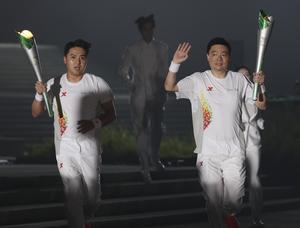 (250807) -- CHENGDU, 7 agosto, 2025 (Xinhua) -- Los portadores de la antorcha Ding Junhui (d) y Dong Dong corren con la llama durante la ceremonia de inauguración de los Juegos Mundiales 2025, en Chengdu, en la provincia de Sichuan, en el suroeste de China, el 7 de agosto de 2025. (Xinhua/Chen Cheng) (da) (ra) (vf)