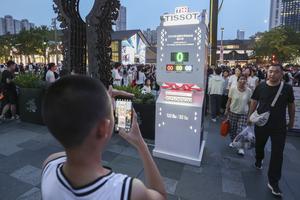 (250807) -- CHENGDU, 7 agosto, 2025 (Xinhua) -- Un niño toma fotografías de un reloj de cuenta regresiva en Taikoo Li Chengdu mientras la ceremonia de inauguración de los Juegos Mundiales 2025 comienza, en Chengdu, en la provincia de Sichuan, en el suroeste de China, el 7 de agosto de 2025. (Xinhua/Zhang Liyun) (rtg) (ra) (vf)