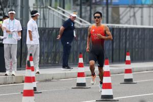(250817) — CHENGDU, 17 agosto, 2025 (Xinhua) — Duan Zhengyu, del equipo de China 1, compite durante la final de relevos mixtos de duatlón en los Juegos Mundiales 2025, en Chengdu, en la provincia de Sichuan, en el suroeste de China, el 17 de agosto de 2025. (Xinhua/Wang Xiang) (oa) (ah)