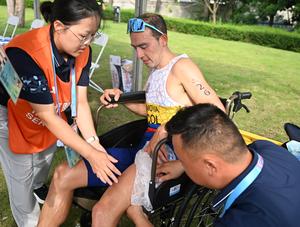 (250814) — CHENGDU, 14 agosto, 2025 (Xinhua) — Brian Moya (c), de Colombia, recibe tratamiento médico durante la final individual masculina de duatlón, en los Juegos Mundiales 2025, en Chengdu, en la provincia de Sichuan, en el suroeste de China, el 14 de agosto de 2025. (Xinhua/Li Jianan) (rtg) (ra) (ce)