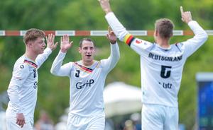 (250809) — CHENGDU, 9 agosto, 2025 (Xinhua) — Jugadores de Alemania festejan durante el partido del grupo A de la ronda preliminar masculina del evento de fistball entre Alemania y Brasil en los Juegos Mundiales 2025, en Chengdu, en la provincia de Sichuan, en el suroeste de China, el 9 de agosto de 2025. (Xinhua/Tenzin Nyida) (oa) (da)
