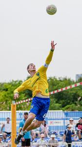 (250809) -- CHENGDU, 9 agosto, 2025 (Xinhua) -- Gabriel Petry Heck, de Brasil, compite durante el partido del grupo A de la ronda preliminar masculina del evento de fistball entre Alemania y Brasil en los Juegos Mundiales 2025, en Chengdu, en la provincia de Sichuan, en el suroeste de China, el 9 de agosto de 2025. (Xinhua/Tenzin Nyida) (oa) (da)